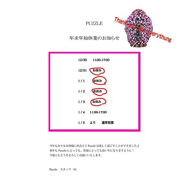 ●また12/29以降の商品の在庫の有無や、メールでのお問い合わせなどににつきましても、1/4以降に順次ご連絡いたします。
