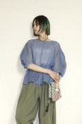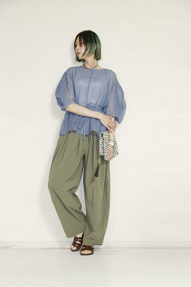 くすみブルーが大人っぽく、甘すぎないブラウススタイルが楽しめます。
