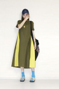 カーキベースのワンピースにサイドのイエローがアクセントになったワンピース