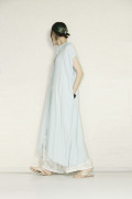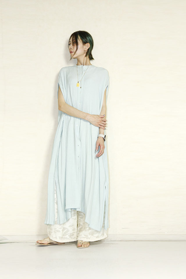 パンツとのレイヤードスタイルは動く度に揺れるワンピースが軽やかな印象に。