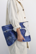 まるで畳んでるデニムジャケットを持ってるかの様に、プリントされたMATATABI(マタタビ)らしい個性あるデザインのクラッチバッグ