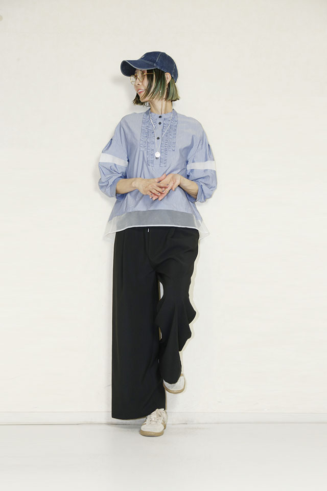 フロントの胸元ギャザーが上品で目を引くブラウス。