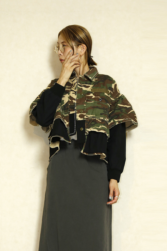 カモフラ柄のミリタリーベースにギャザーやレイヤードデザインを施したジャケット