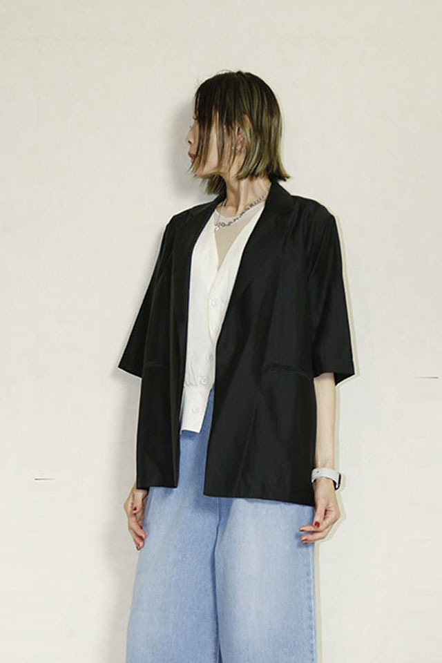 シーンを選ばず、上品な軽やかさとモード感を兼ね備えた、洗練されたワードローブに必須の万能ジャケットです。