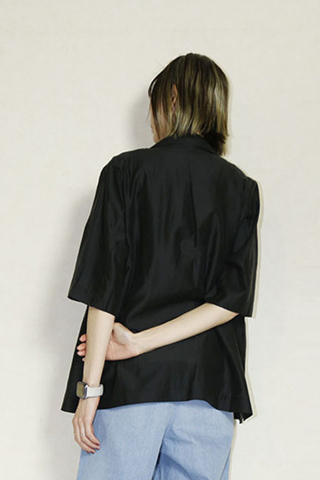 程よい透け感が涼しげで、肌に触れるテンセルの柔らかさが心地よく、アセテート特有の自然な光沢が上品な印象を添えます。