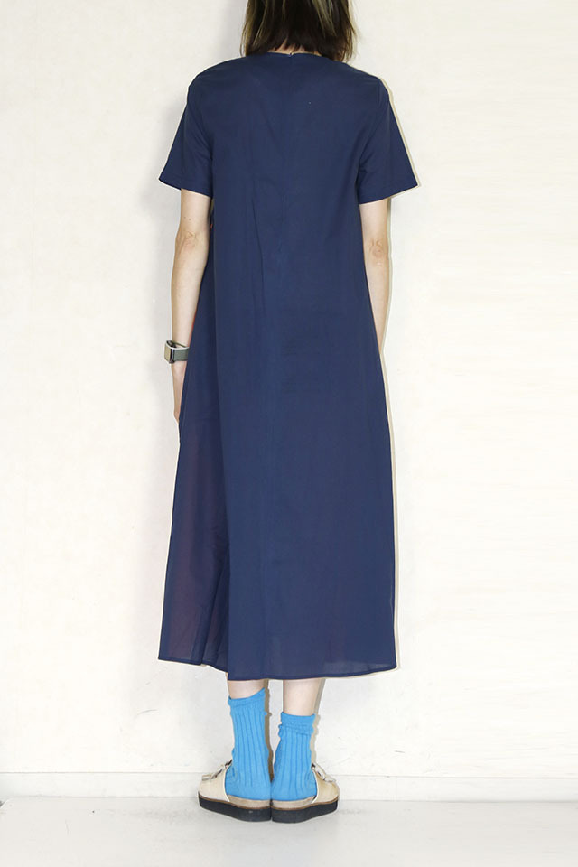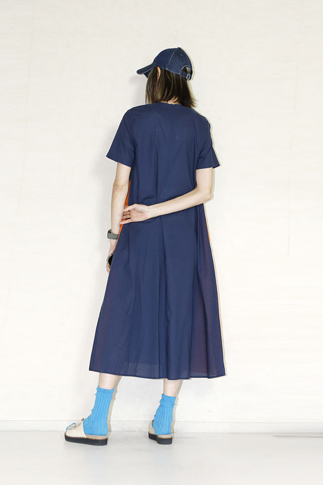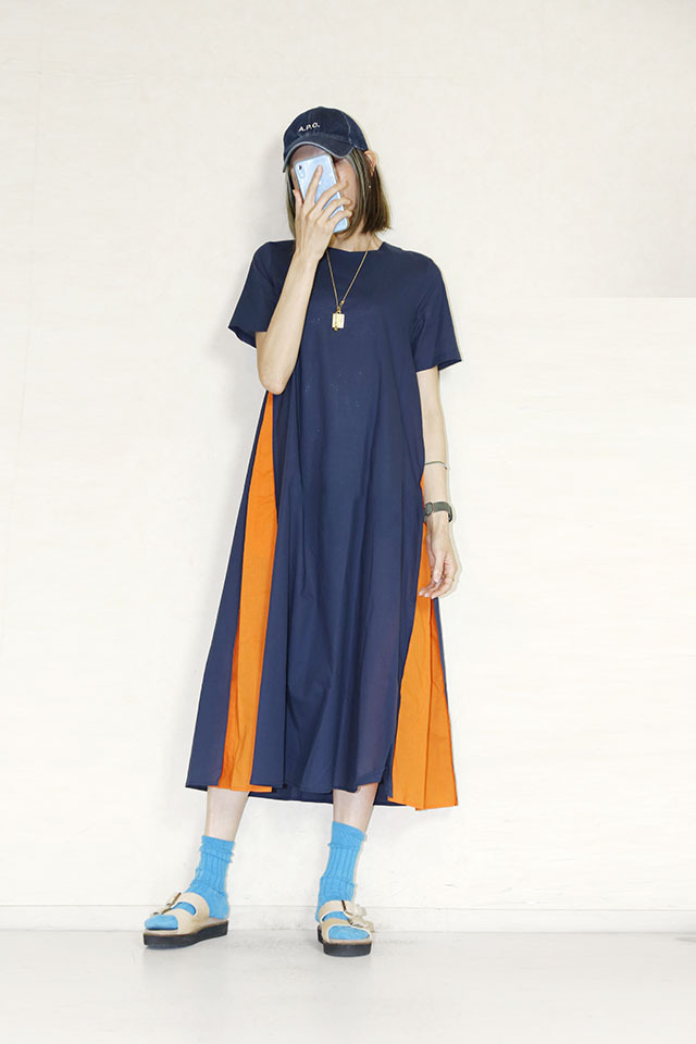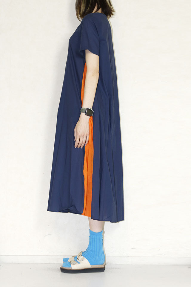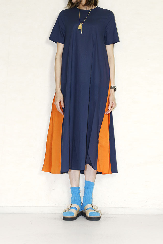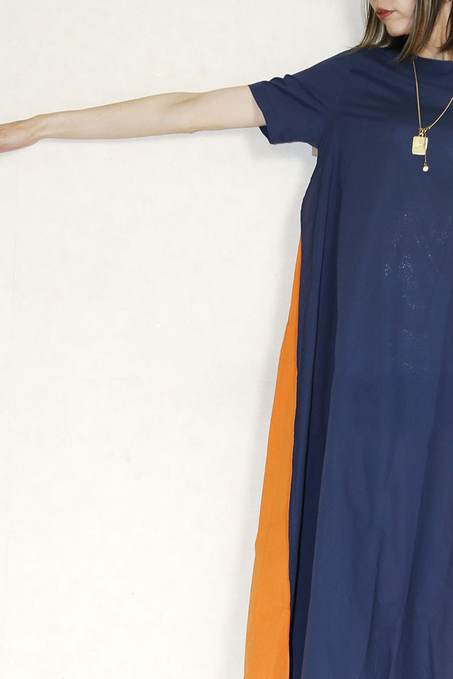 ネイビーベースのワンピースにサイドのオレンジがアクセントになったワンピース