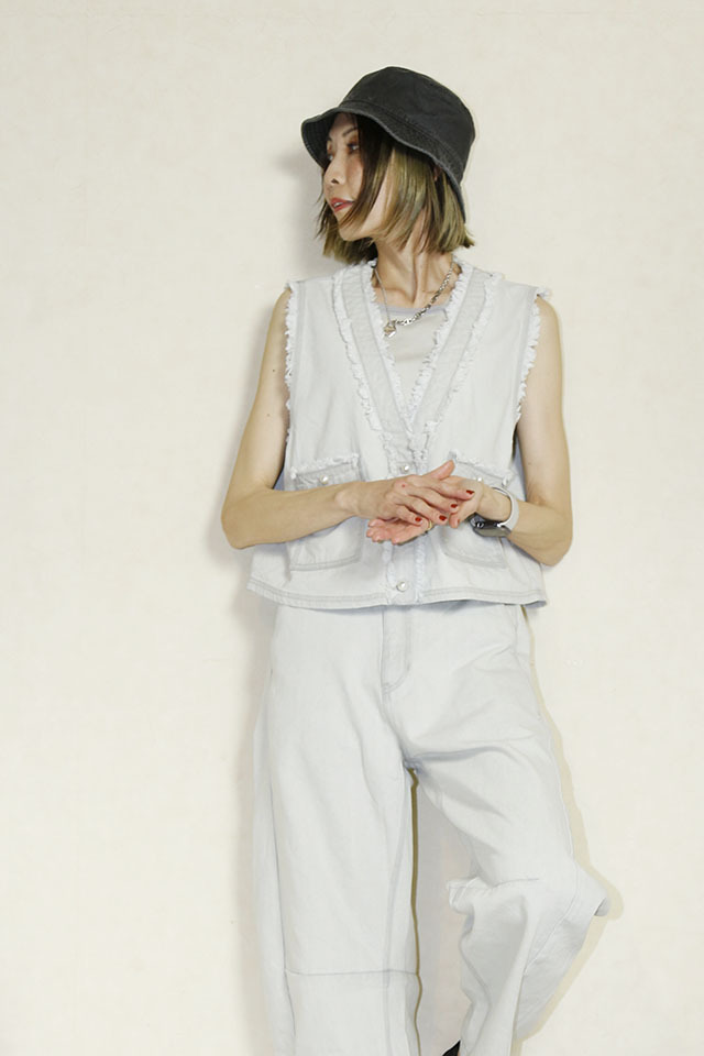 ややグレーかかったホワイトデニムに、カットオフやパールボタンがアクセントになったベストです。