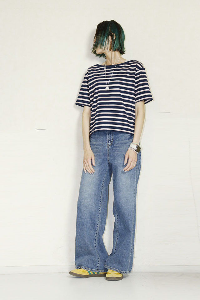 スニーカーを履いても、ボートネックなので洗練された印象になります。